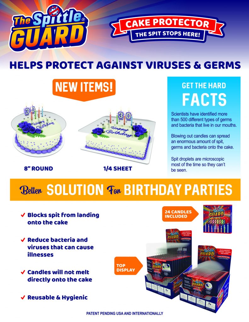 SpittleGuard is a see through plastic that get’s placed over the cake so when the birthday person blows out their candles they can no longer spit all over the cake.