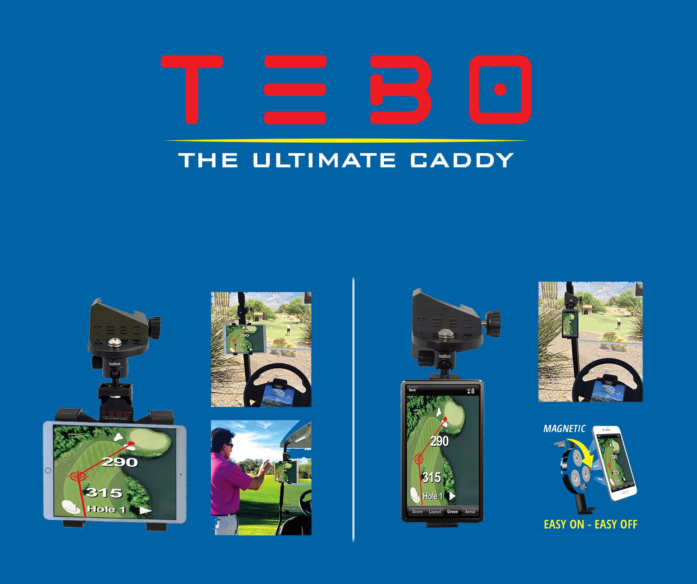 There are several version of the TEBO Ultimate Caddy. One Is the Tablet Caddy which consist of a device that mounts onto the frame of the Golf Cart.